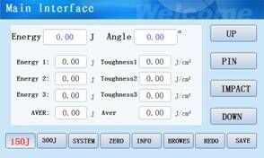 半自動化:試驗時先手動取擺,完成后手動放料,然后進行退銷、沖擊。沖擊完畢,設備自動取擺。每次實驗完成后系統顯示區域將顯示沖擊能量及沖擊韌度。三次試驗為一組,一組完成后系統自動計算三次沖擊能量的平均值。